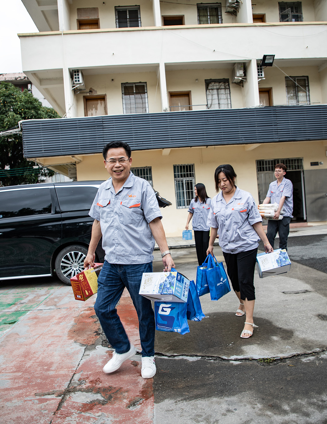 Manager Liu carring holiday gifts, with big smile on his face